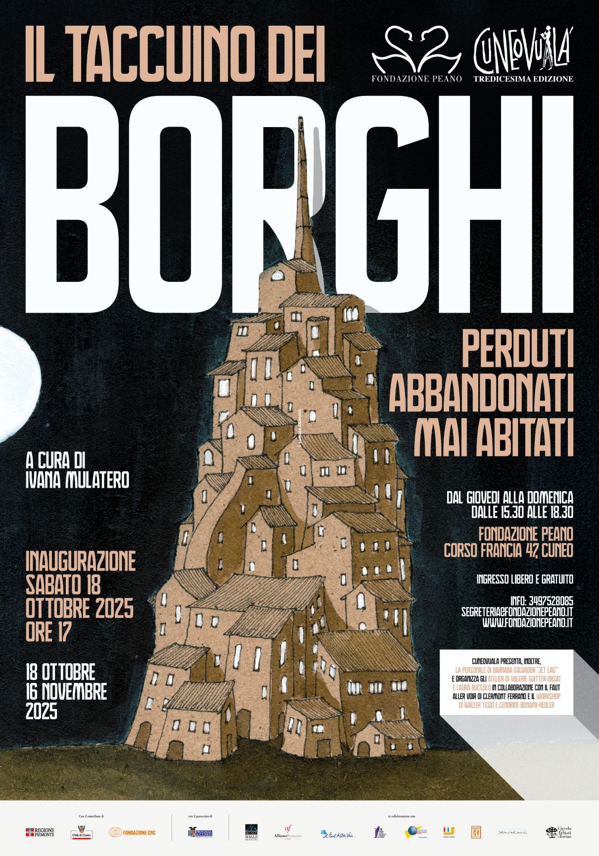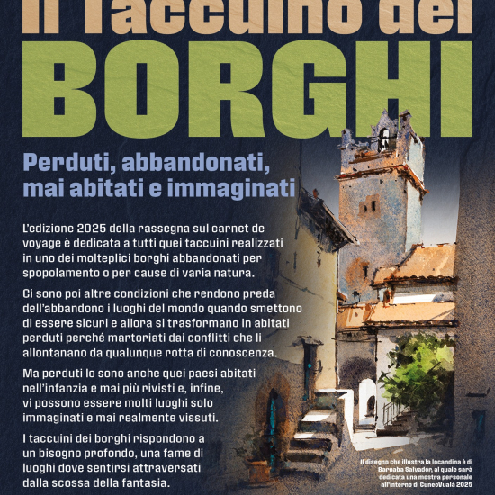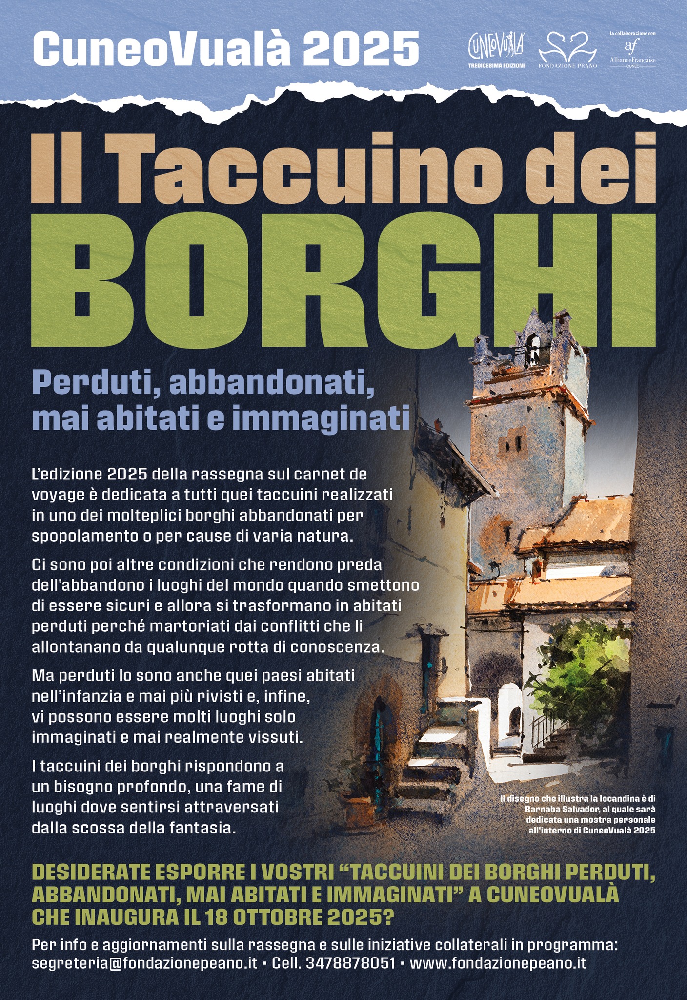Sabato 18 ottobre prende il via la tredicesima edizione di “CuneoVualà”, la rassegna in cui emergono carnet de voyage mai esposti, o poco conosciuti al pubblico, di straordinari disegni realizzati sul tema "Il Taccuino dei Borghi. Perduti, abbandonati, mai abitati e immaginati" L'esposizione resterà aperta fino a domenica 16 novembre con il seguente orario: da giovedì a domenica, ore 15.30-18.30 (Fondazione Peano, C.so Francia 47 Cuneo). Ingresso gratuito.
