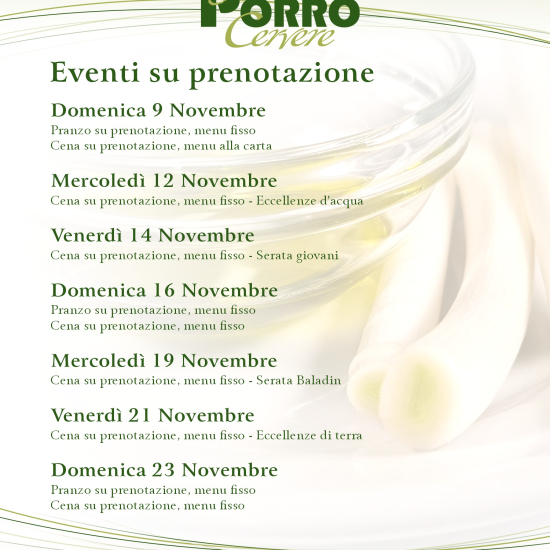 Da sabato 8 a domenica 23 novembre ritorna uno degli eventi enogastronomici più importanti e conosciuti del Piemonte con la 46^ edizione della "Fiera del Porro di Cervere", rinomata vetrina delle eccellenze del territorio e non solo. In locandina le date degli appuntamenti enogastronomici con prenotazione obbligatoria al 0172 1640001 dalle ore 19 alle 22. Per conoscere i menù: clicca qui.