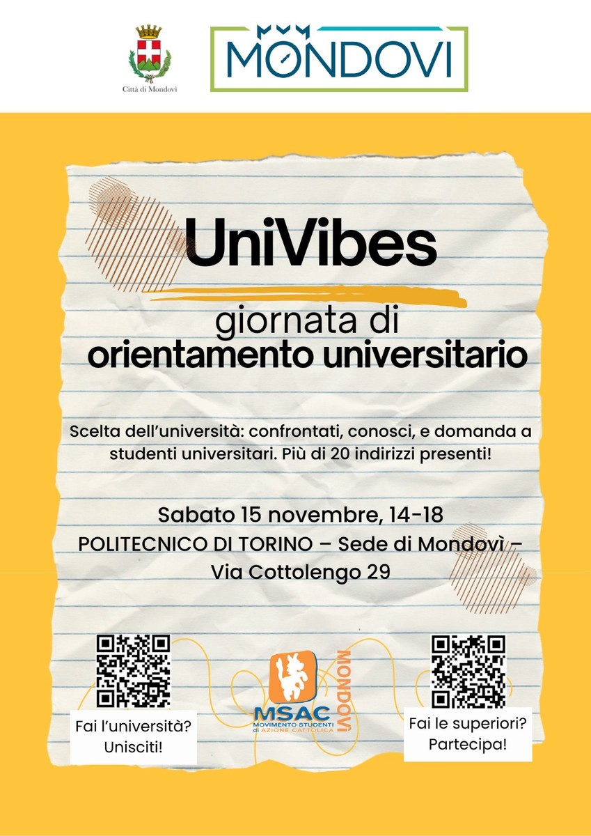 Nella giornata di sabato 15 novembre, dalle 14 alle 18, il Movimento Studenti di Azione Cattolica (MSAC) organizza la seconda edizione di UniVibes, una giornata di orientamento universitario in cui gli studenti monregalesi potranno confrontarsi, conoscere e porre domande ad universitari di molti indirizzi. L’obiettivo è dare la possibilità alle quarte e quinte superiori, ed eventuali altri interessati, di avere un contatto diretto con studenti universitari e quindi formare la loro scelta universitaria. Ritrovo presso la sede del Politecnico di Torino - Sede di Mondovì.