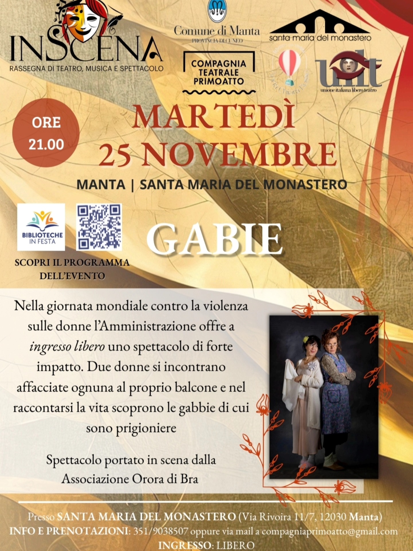 In occasione degli eventi per la Giornata internazionale contro la violenza sulle donne, martedi 25 novembre alle ore 21 presso il complesso di Santa Maria al Monastero a Manta, l’ Associazione Orora di Bra porta in scena lo spettacolo “GABIE”. Seguirà un dialogo-confronto con l’associazione MAI+SOLE. Ingresso libero.