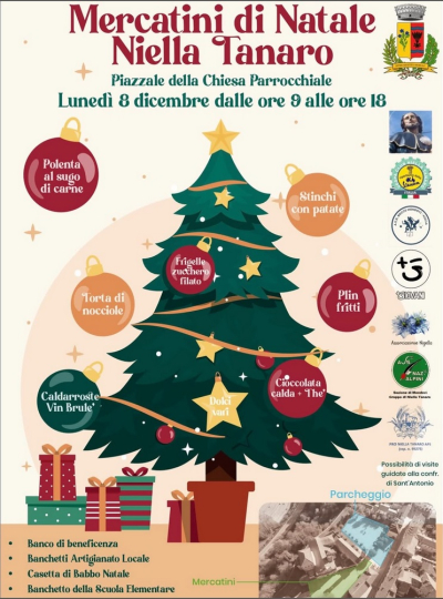 Lunedì 8 dicembre 2025, dalle 9.00 alle 18.00 Niella Tanaro festeggia con i Mercatini di Natale nel piazzale della chiesa parrocchiale: una giornata dedicata all’atmosfera delle feste, tra profumi di piatti caldi e bancarelle.