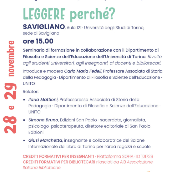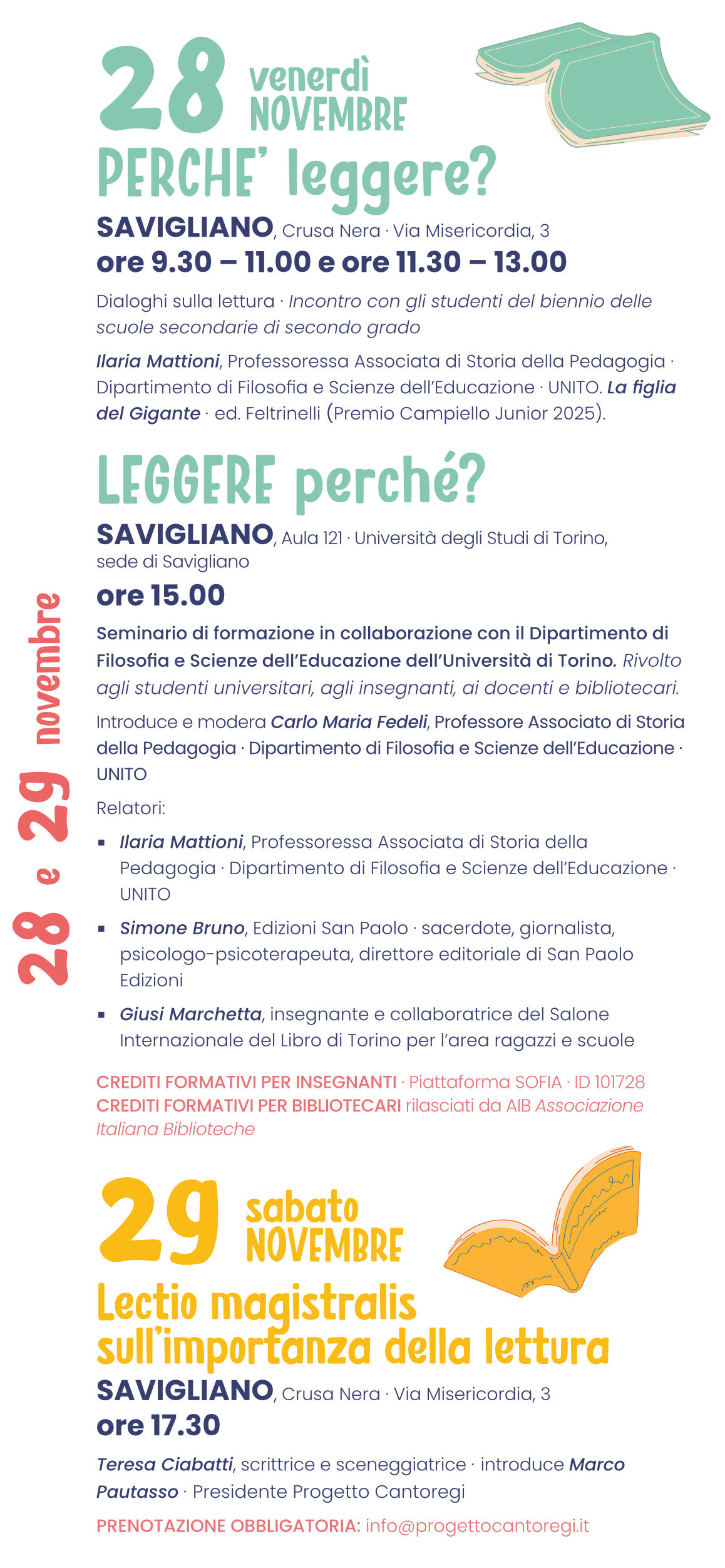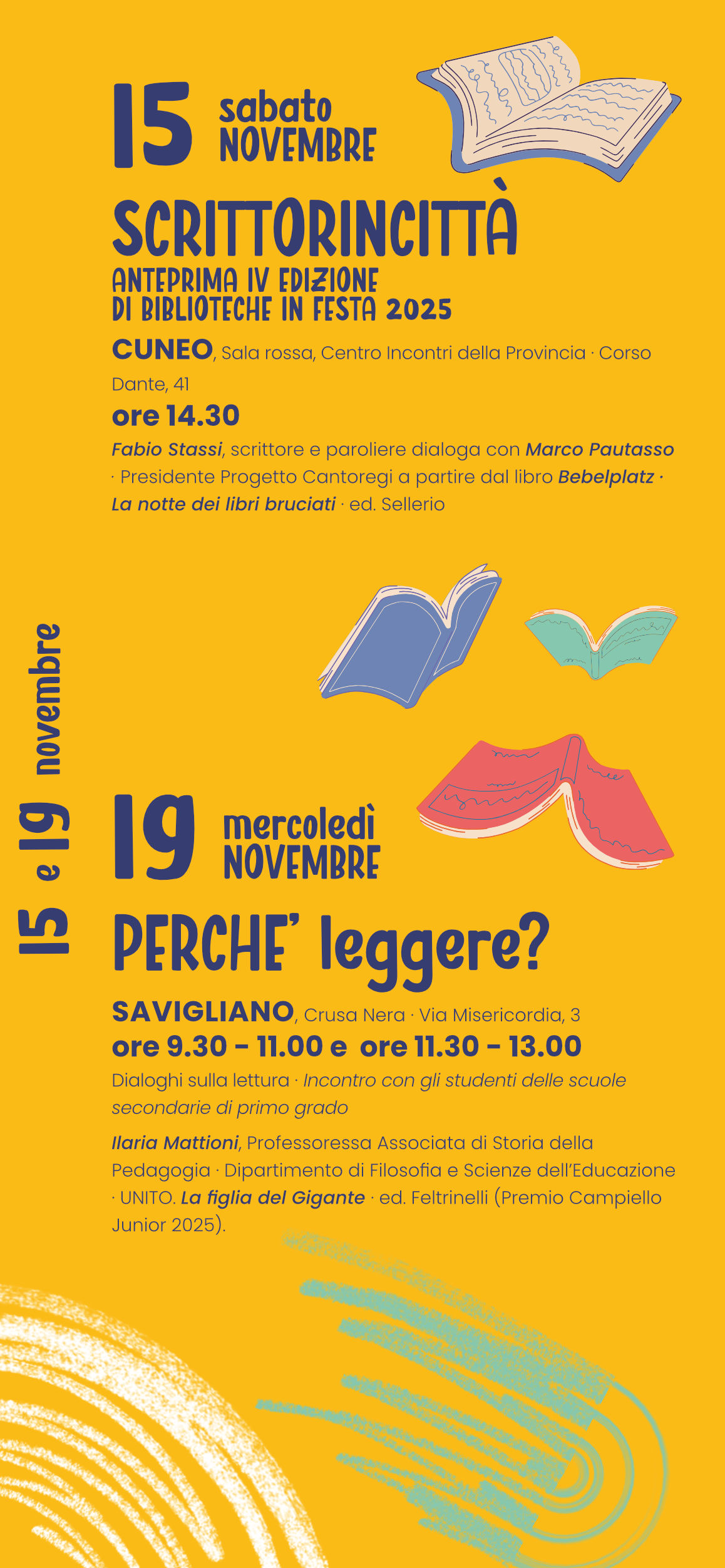 Ritorna "Biblioteche in festa", l’innovativo format culturale ideato e promosso da Associazione Le Terre dei Savoia e da Progetto Cantoregi, pensato per rimettere al centro i libri, i luoghi che li ospitano e le persone che se ne prendono cura, per un’edizione 2025 rivolta soprattutto ai ragazzi e giovani adulti. A Savigliano sono in programma appuntamenti previsti il 19, 28 e 29 novembre. Ingresso libero.