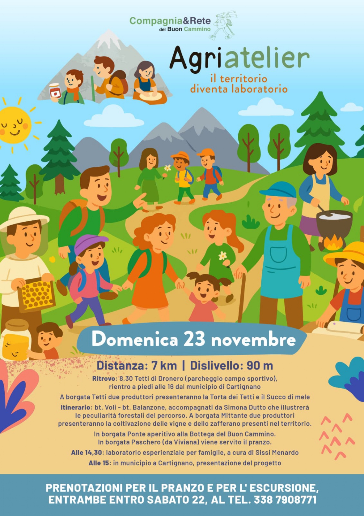 Domenica 23 novembre il territorio di Dronero e Cartignano ospiteranno una nuova edizione dell’Agriatelier, iniziativa promossa dalla Compagnia & Rete del Buon Cammino. L’appuntamento è fissato alle ore 8.30 presso il parcheggio del campo sportivo della borgata Tetti di Dronero, punto di ritrovo per una camminata di circa sette chilometri.. Il rientro è previsto a piedi alle ore 16, con arrivo al municipio di Cartignano. Prenotazione obbligatoria.