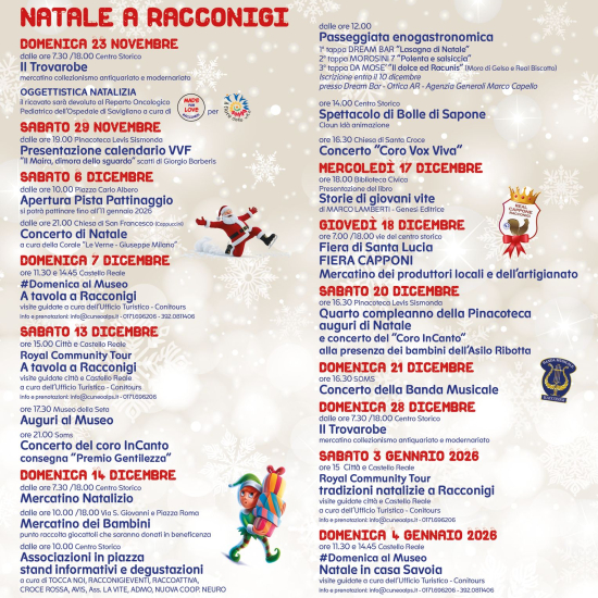 Dal 23 novembre al 4 gennaio Racconigi festeggia il periodo natalizio con tantissimi eventi dedicati, musica, mercatini, visite guidate, enogastronomia e tanto divertimento per grandi e piccini. Scopri il programma completo nella locandina in basso.