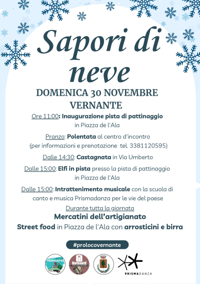 Sapori di Neve a Vernante: pattinaggio, polentata e mercatini in programma domenica 30 novembre. Con l'avvicinarsi della stagione fredda, Vernante, il suggestivo "Paese di Pinocchio", si prepara ad accogliere l'inverno con la tradizionale manifestazione "Sapori di Neve", un evento organizzato dalla Pro Loco Vernante che unisce gusto, musica e divertimento.