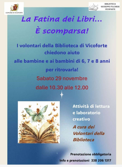 Sabato, 29 novembre 2025 I volontari della Biblioteca di Vicoforte chiedono aiuto ai bambini e alle bambine dai 6 agli 8 anni per ritrovare la Fatina dei Libri!