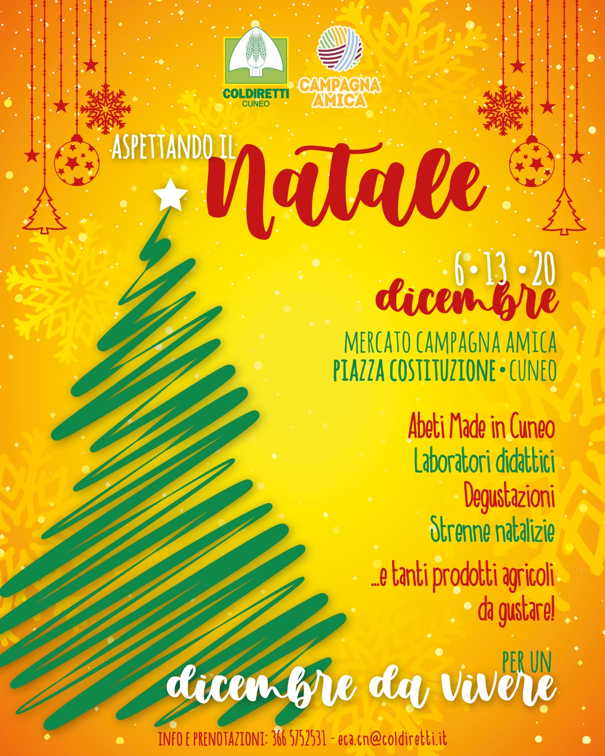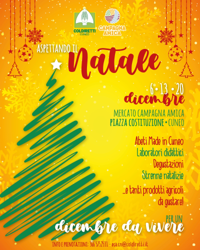 Sabato 6, 13 e 20 dicembre torna il mercato di Campagna Amica, in piazza Costituzione a Cuneo. Abeti Made in Cuneo, laboratori didattici, ma anche degustazioni e tanti prodotti agricoli da assaporare. Un'occasione per passeggiare nel capoluogo immerso nell'atmosfera di Natale, negli stessi giorni dei mercatini di via Roma