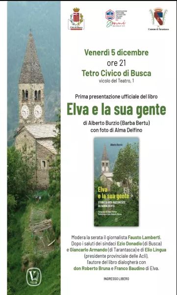 Venerdì 5 dicembre, alle ore 21, il Teatro Civico di Busca ospiterà la prima presentazione del libro “Elva e la sua gente” di Alberto Burzio (Barba Bertu), con fotografie di Alma Delfino. La serata sarà moderata dal giornalista Fausto Lamberti. l’autore dialogherà con don Roberto Bruna e Franco Baudino, entrambi di Elva. L’ingresso è libero e aperto a tutta la cittadinanza.