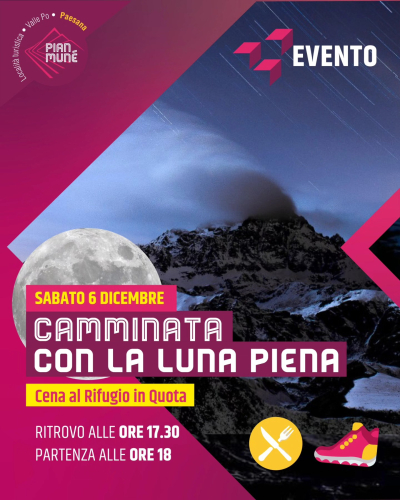 Sabato 6 dicembre, dalle ore 18.30, a Pian Muné (Paesana) è organizzata una camminata con la luna piena che prevede una salita alla baita in quota con guida naturalistica e, a seguire, cena conviviale e tipica alla baita Pian Croesio. Attività adatta a tutti purché abituati a camminare. Prenotazione obbligatoria.