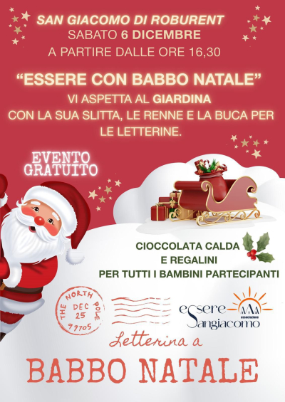 In attesa del Natale, l’associazione Essere Sangiacomo ETS organizza “Essere con Babbo Natale”. Sabato 6 dicembre dalle ore 16.30, Babbo Natale arriverà al Giardina con la sua slitta, le sue renne e la buca per spedire la letterina. A tutti i bambini partecipanti verrà offerta cioccolata calda e regalini.