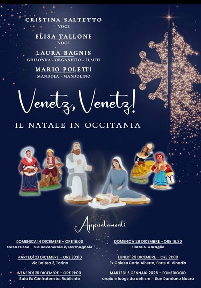 Lunedì 29 dicembre, alle ore 21, presso la ex Chiesa della Caserma Carlo Alberto a Vinadio è organizzato un concerto di Natale. 2 voci accompagnate dal suono della ghironda, dell'organetto, del flauto, delle mandole e del mandolino per riprendere le tipiche musiche della tradizione occitana. Ingresso libero.