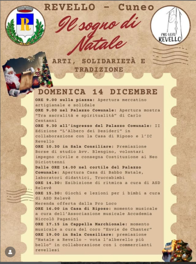 Domenica 14 dicembre, dalle ore 9.00, la pro loco di Revello organizza "Il sogno di Natale", una giornata ricca di tradizione, arte, solidarietà e momenti dedicati a grandi e piccini. Un' occasione per incontrarsi, vivere il paese e sentirsi parte della comunità.