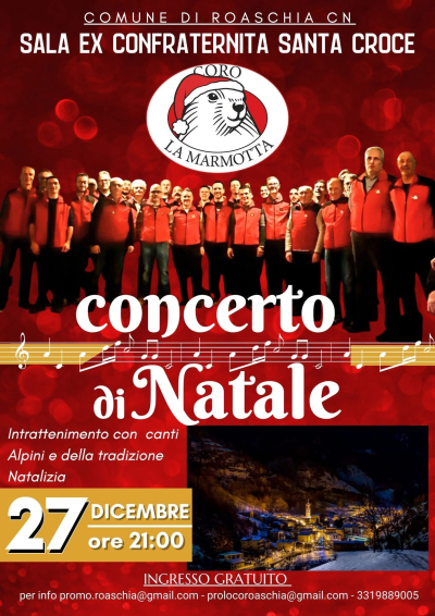 Sabato 27 dicembre, alle ore 21 presso la sala ex confraternita di Roaschia, la corale "La Marmotta" intratterrà il pubblico con canti alpini e della tradizione natalizia. Ingresso libero.