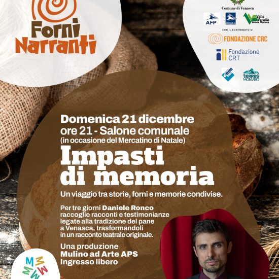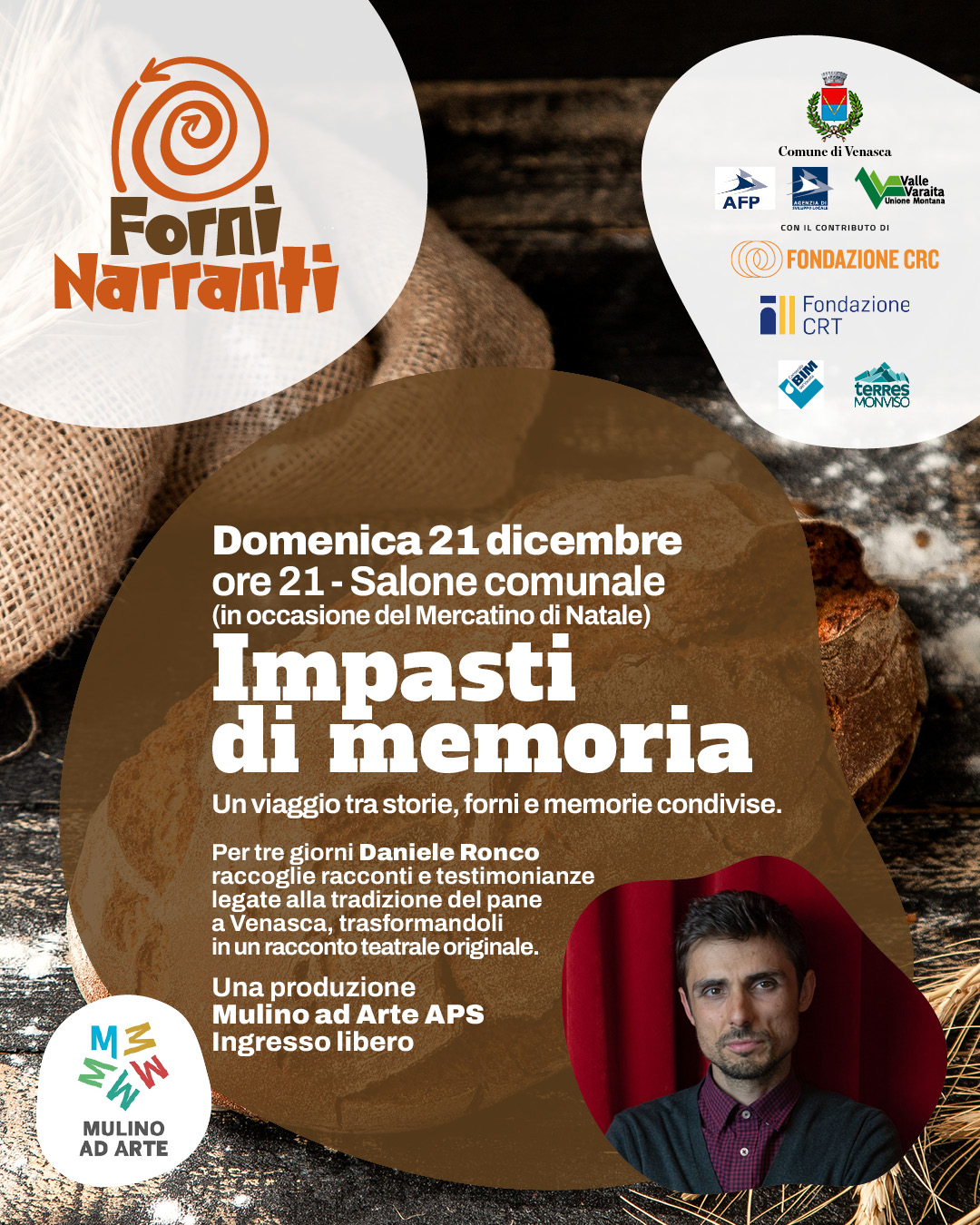 Forni Narranti è una manifestazione culturale originale e alla sua prima edizione, nata su un substrato identitario per Venasca: quello della tradizione della panificazione. “Forni Narranti” nasce non solo come festival culturale, ma come momento di riscoperta delle radici locali e di costruzione di nuovi ponti tra passato e presente e tra diversi luoghi, trasformando Venasca in un laboratorio di memoria viva e creatività condivisa. Fino al 21 dicembre, la rassegna porta in paese un ricco calendario di eventi, tutti a ingresso libero, dedicati alle storie del pane, inteso non solo come alimento ma come simbolo di cultura, condivisione e memoria collettiva.