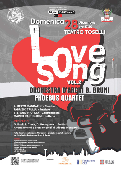 Ultimo appuntamento della stagione Bruni d’Autunno 2025 domenica 28 Dicembre ore 17.30 al Teatro Toselli: "Love song" con ORCHESTRA D'ARCHI B. BRUNI e PHOEBUS QUARTET.