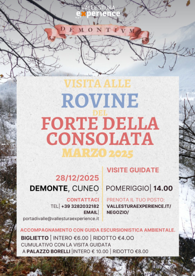 Domenica 28 dicembre, a parte dalle ore ore 14 presso la biblioteca civica di Demonte, la guida Stefano Melchio racconterà la storia e i segreti che si celano all'interno del forte della Consolata, divenne una delle opere più significative dello sbarramento difensivo piemontese fino alla sua distruzione nel 1796. Ingresso libero.