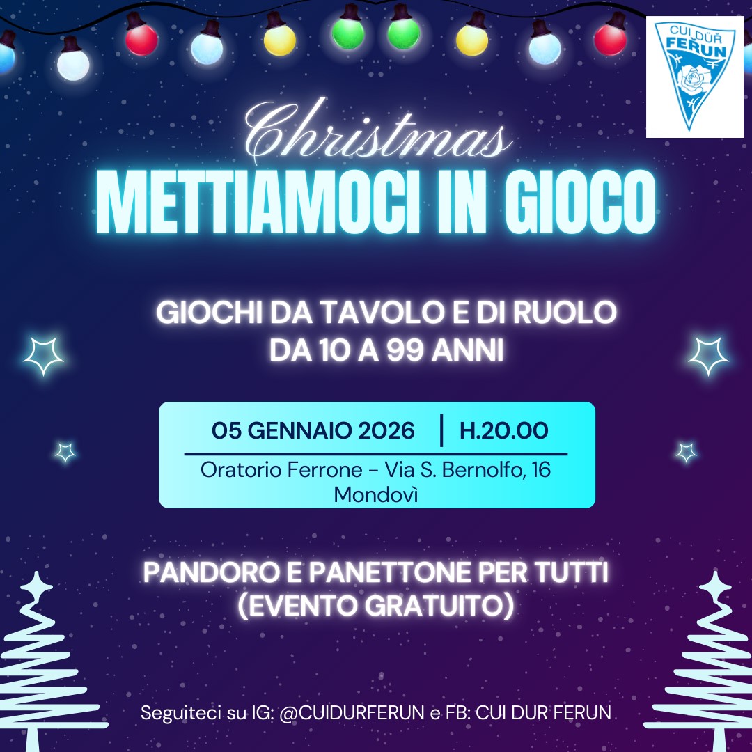 Il primo appuntamento dell'anno di “Mettiamoci in gioco” avrà luogo lunedì 5 gennaio 2026 a partire dalle ore 20 presso i locali dell’oratorio della Parrocchia di Santa Maria Maggiore a Mondovì Borgo Ferrone in Via San Bernolfo n.16.