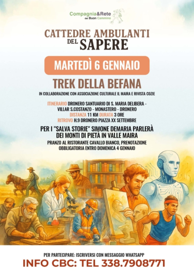 La Compagnia & Rete del Buon Cammino invita tutti e tutte al Trek della Befana, martedì 6 gennaio con ritrovo alle 9.00 in piazza XX settembre a Dronero, alla volta di un percorso di 11 km e circa 3 ore di cammino (tappe dell'itinerario nella locandina allegata). Per i "Salva Storie", Simone Demaria parlerà dei monti di pietà in Valle Maira. Pranzo al ristorante Cavallo Bianco, prenotazione obbligatoria entro domenica 4 gennaio. Iscrizione obbligatoria tramite messaggio WhatsApp al numero +39 338 790 8771.