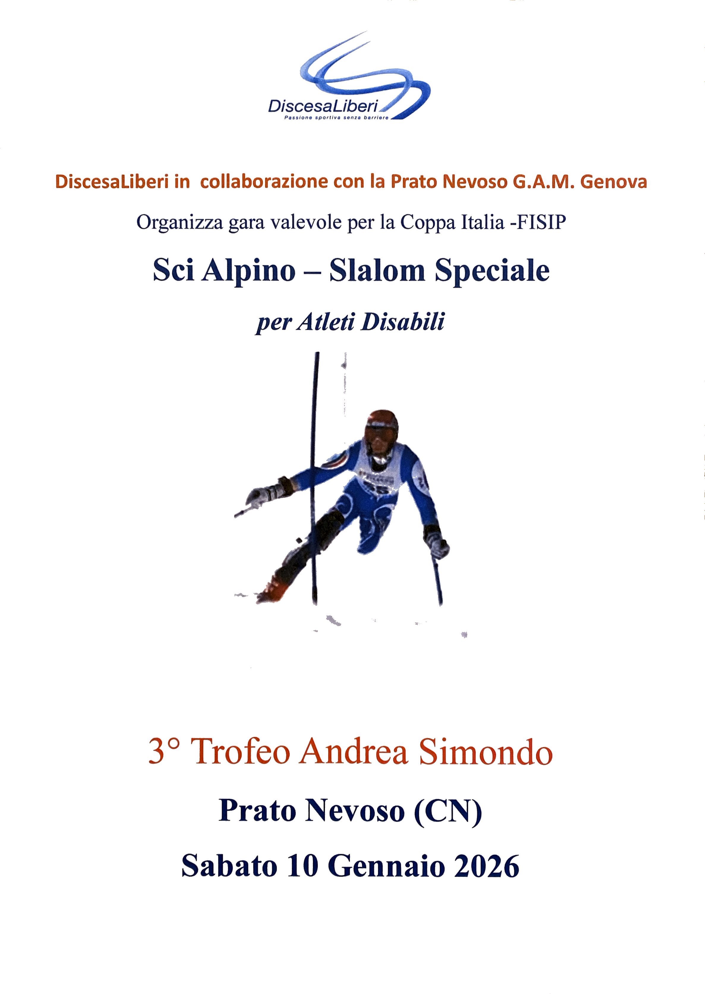 Discesaliberi in collaborazione con la Prato Nevoso G.A.M. Genova organizza la gara valevole per la Coppa Italia -FISIP Sci Alpino -  Slalom Speciale per Atleti Disabili a Prato Nevoso (Frabosa Sottana) sabato 10 Gennaio 2026, 3° Trofeo Andrea Simondo.