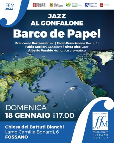 Domenica 18 gennaio alle ore 17.00 presso la Chiesa dei Battuti Bianchi a Fossano ritorna la la rassegna della Fondazione Fossano Musica dedicata alle melodie jazz. Il primo appuntamento del nuovo anno è Barco de Papel, un concerto–viaggio tra jazz e suggestioni centro-sudamericane. Una “barchetta di carta” che diventa metafora del nostro tempo, tra ricerca, poesia e nuove sonorità. Ingresso 5€.