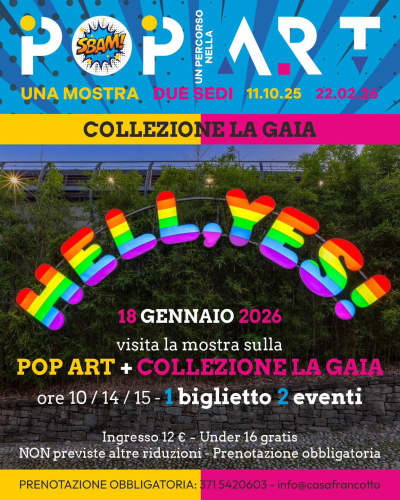 Domenica 18 gennaio a Busca, oltre alla visita guidata alla mostra Sbam! Un percorso nella Pop Art in Casa Francotto, esclusiva visita guidata alla prestigiosa collezione di arte contemporanea La Gaia, situata sulla collina. Tre turni di visite guidate: ore 10 - 14 - 15 con ritrovo in Casa Francotto. Durata circa due ore e mezza, includendo anche la visita guidata alla mostra. Ticket 12 € biglietto unico, gratuito under 16. Prenotazione obbligatoria.
