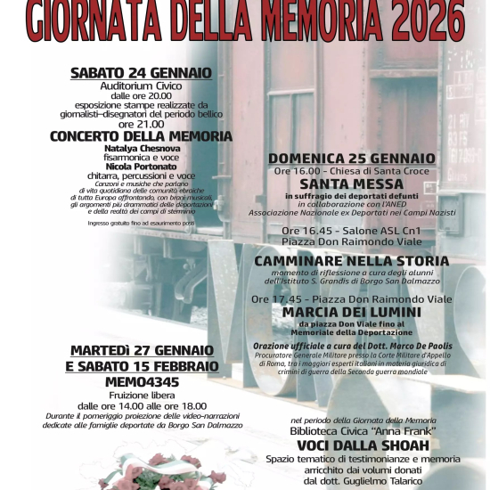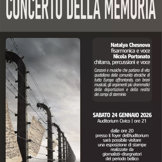 Sabato 24 gennaio, all’Auditorium Civico, dalle ore 20.00 sarà possibile visitare l’esposizione delle stampe realizzate da giornalisti e disegnatori del periodo bellico. Alle ore 21.00 seguirà il Concerto della Memoria con Natalya Chesnova (fisarmonica e voce) e Nicola Portonato (chitarra, percussioni e voce)