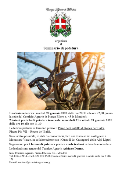 Il Comizio Agrario organizza il "Seminario di potatura", con una lezione teorica martedì 20 gennaio 2026 dalle ore 20,30 alle ore 22 presso la sede del Comizio Agrario in Piazza Ellero n. 45 in Mondovì e 2 lezioni pratiche di potatura invernale: mercoledì 21 e sabato 24 gennaio 2026 dalle ore 10 alle ore 11,30 al Parco del Castello di Rocca de’ Baldi, Piazza Pio VII – Rocca de’ Baldi.