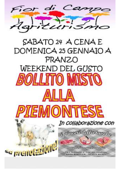 Sabato 24 a cena e domenica 25 gennaio a pranzo, presso l'Ostello del Monastero di Dronero, Coldiretti Cuneo insieme a Campagna Amica e Terra Nostra organizza il Weekend del Gusto, un evento imperdibile per gli amanti della buona tavola. Protagonista assoluto sarà il bollito misto alla piemontese preparato secondo la tradizione e accompagnato da vini selezionati del territorio per esaltarne i sapori. Un'occasione unica per scoprire i piatti tipici della regione e vivere un'esperienza gastronomica autentica. Prenotazione obbligatoria.