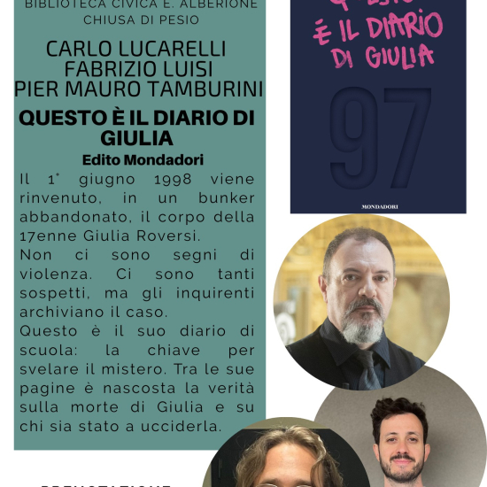 Mercoledì 4 febbraio alle ore 21.00 in Biblioteca civica "E. Alberione" di Chiusa di Pesio incontro con Carlo Lucarelli, Pier Mauro Tamburini, Fabrizio Luisi con il loro libro enigma dal titolo “Questo è il diario di Giulia”.