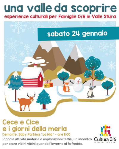 Sabato 24 gennaio, alle ore 11,00 presso il Baby Parking "La Nià" a Demonte, Valle Stura Experience e Noao Officina Culturale organizzano il laboratorio "Cece e Cice e i giorni della merla". Piccole attività motorie ed esplorazioni tattili dedicate alle famiglie con bambine e bambini 0–6 anni. Attività a numero chiuso, prenotazione obbligatoria.