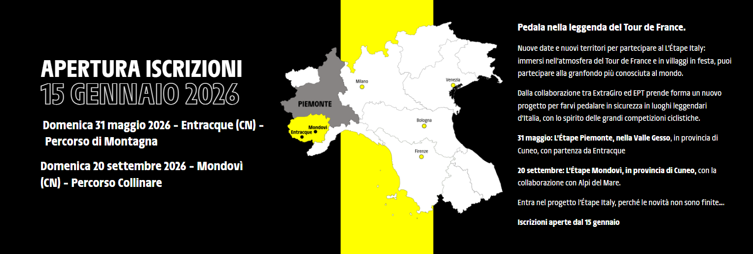La passione per il ciclismo e la valorizzazione del territorio si incontrano nella Granfondo Alpi del Mare, un evento che si unisce a "L'Etape", un evento legato al mitico Tour de France. La manifestazione si terrà domenica 31 maggio a Entracque in una tappa di montagna di 130 km (dislivello 2.500 metri) con partenza da Entracque e due giorni di festa nel «village» dedicato. Iscrizioni qui. Ulteriori dettagli in merito allo svolgimento della giornata presto disponibili.