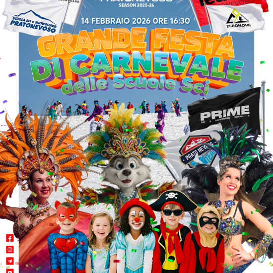 Sabato 14 febbraio ore 16.30 a Prato Nevoso (Frabosa Sottana) grande festa di Carnevale con le scuole di sci per grandi e piccini. Maggiori informazioni e prenotazioni presso le scuole di sci, clicca qui per i contatti.