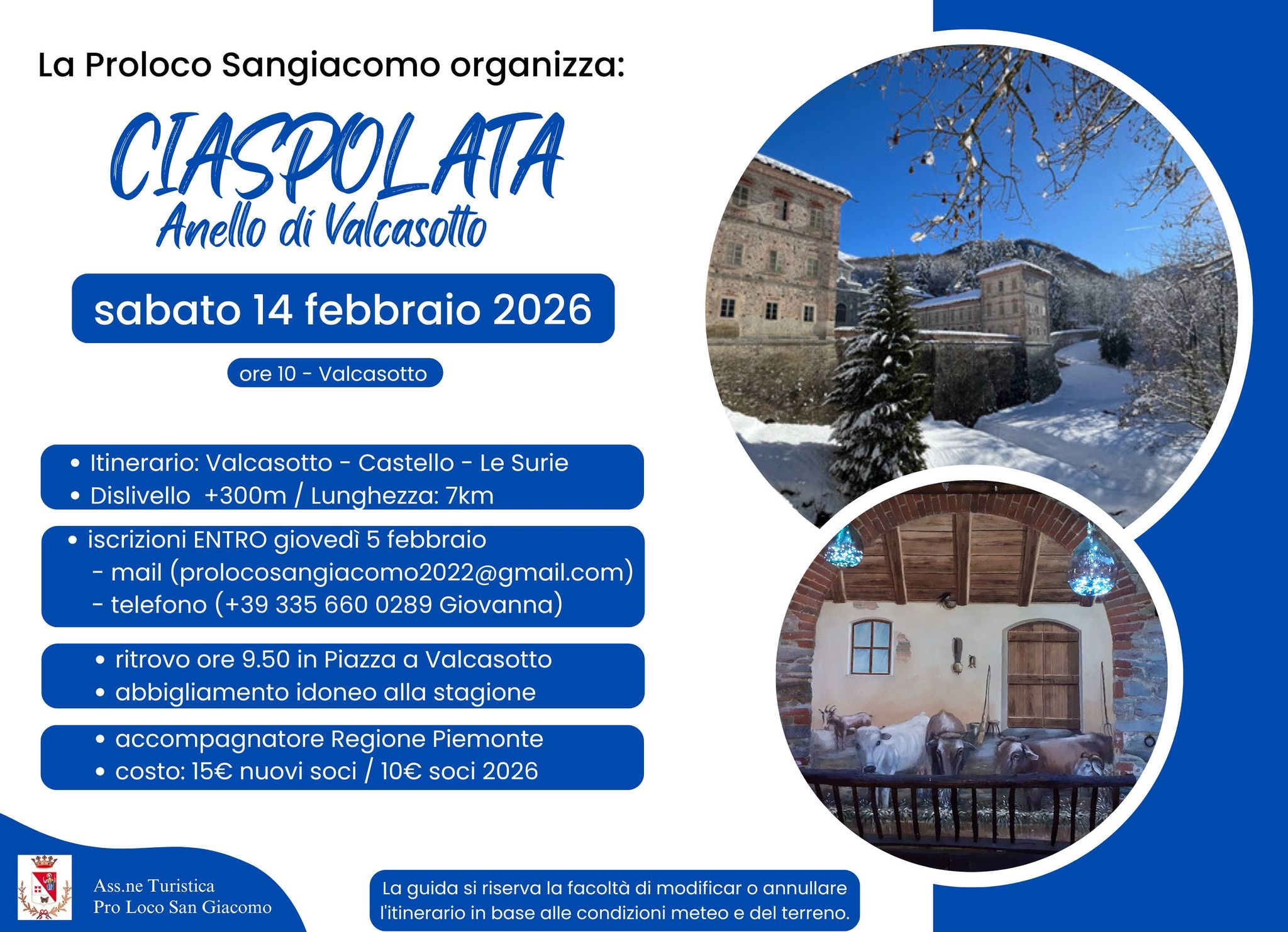 Sabato 14 febbraio la Pro Loco San Giacomo organizza una "Ciaspolata - Anello di Valcasotto". Il ritrovo alle ore 9:50 in piazza a Valcasotto. L'iscrizione entro giovedì 5 febbraio via email o per telefono è obbligatoria e la quota di partecipazione è di 15 euro per i nuovi soci e di 10 euro per i soci 2026.