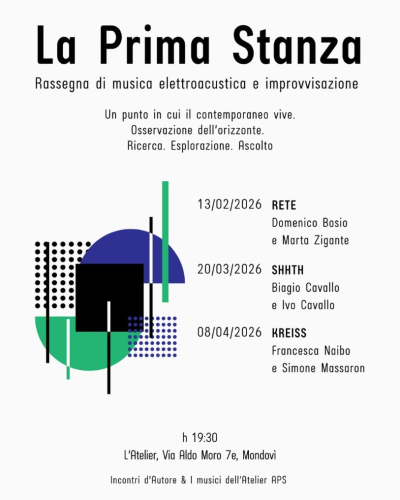 Incontri d'Autore e I musici dell'Atelier APS propongono "La Prima Stanza" una rassegna di musica elettroacustica e improvvisazione, con artisti straordinari del campo della musica sperimentale, abili esploratori del suono che ci porteranno in terreni acustici sconosciuti. La seconda tappa di questo viaggio avventuroso è venerdì 20 marzo alle ore 19.30 presso l'Atelier, in via Aldo Moro 7, in compagnia di Biagio e Ivo Cavallo.