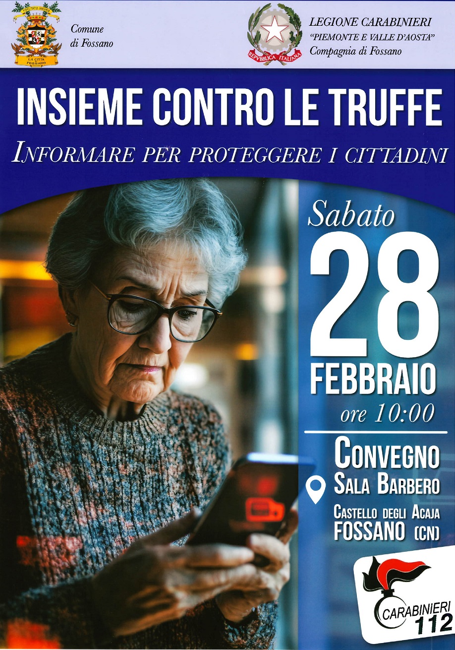 Sabato 28 febbraio alle ore 10.00, presso la Sala Barbero nel Castello degli Acaia a Fossano, convegno "Insieme contro le truffe - Informare per proteggere i cittadini". A cura del Comune di Fossano, con la partecipazione della Legione Carabinieri Piemonte e Valle d'Aosta - Compagnia di Fossano. Ingresso libero fino ad esaurimento posti.