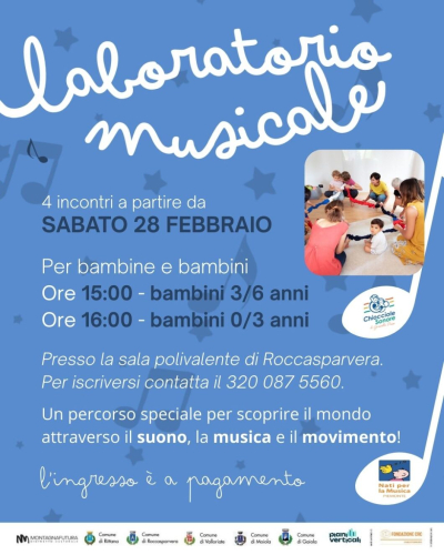 A Roccasparvera arriva Suoni, Musica e Movimento, un corso di quattro date (a partire dal 28 febbraio) pensato per accompagnare bambine e bambini in un percorso di scoperta attraverso il linguaggio universale della musica. L’iniziativa propone un’esperienza educativa e sensoriale che unisce suono, musica e movimento, favorendo lo sviluppo dell’ascolto, della creatività e della relazione. Iscrizione obbligatoria, ingresso a pagamento.
