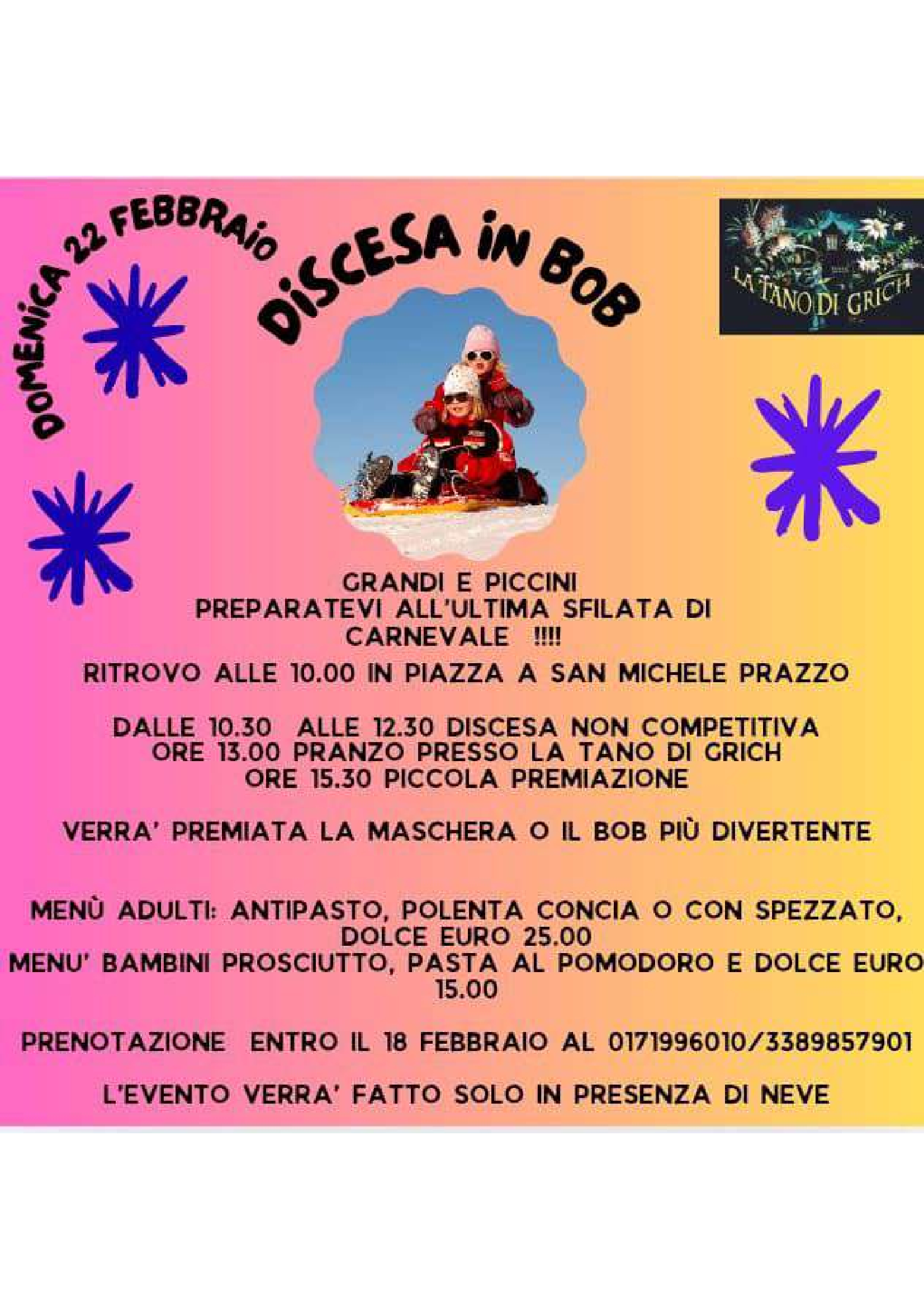 Domenica 22 febbraio, dalle ore 10.00, a San Michele di Prazzo torna la "Discesa in Bob", l'appuntamento più divertente del Carnevale all'insegna del gioco e della convivialità aperto a grandi e piccini. Prenotazione obbligatoria entro il 18 febbraio.