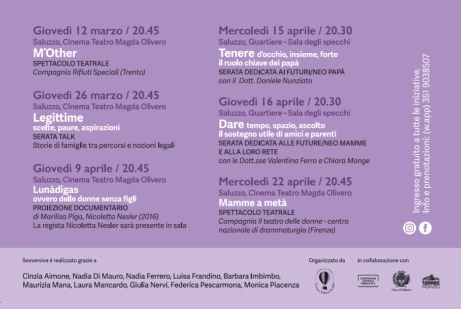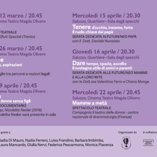 Giovedì 12 marzo alle ore 20.45 a Saluzzo, presso il Cinema Teatro Magda Olivero (via Palazzo di Città, 15), vi aspetta "M'Other" della Compagnia Rifiuti Speciali di Trento, uno spettacolo che analizza il senso di inadeguatezza legato al ruolo materno, e il delicato equilibro tra l'essere figlia e il diventare madre. L'evento è il primo della rassegna teatrale "Sovversive", quest'anno dedicata alla genitorialità come scelta consapevole. Ingresso gratuito, prenotazione tramite il sito Eventbrite.