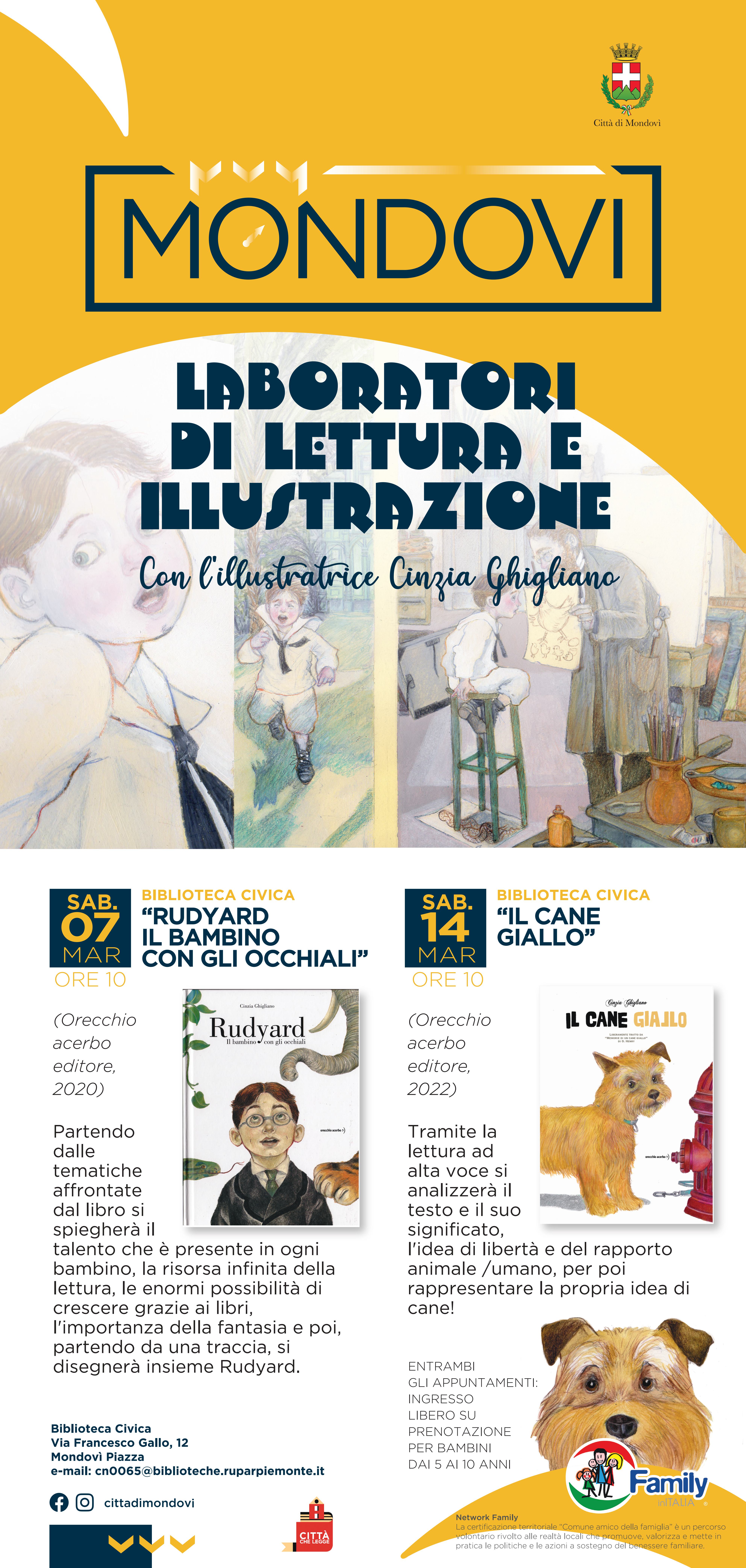 Anche per il 2026 continua la proposta culturale realizzata negli spazi della biblioteca civica di Mondovì che vede protagonisti i bambini a partire dai 4 anni. Sabato 14 marzo alle ore 10 si propone un laboratorio di lettura ad alta voce ispirato alla pubblicazione "Il cane giallo", seguito da un'illustrazione eseguita dai bambini. La partecipazione ai due appuntamenti proposti è libera ma è gradita la prenotazione.