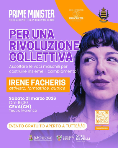 Prime Minister Alpi – Fuori dai margini. Sabato 21 marzo alle 16.30 presso il Teatro Marenco di Ceva, l’attivista Irene Facheris incontra il pubblico in un viaggio tra femminismo, ruoli di genere e riflessioni sulle responsabilità di tutti e di ciascuno. Ingresso libero.