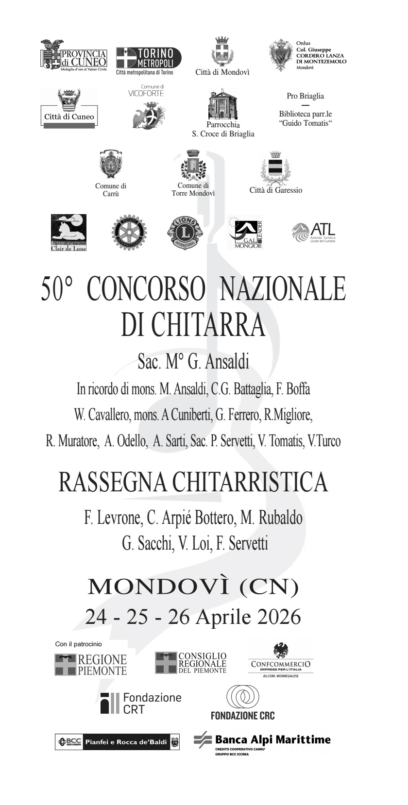 Arriva dal 24 al 26 aprile la 50° edizione il “Concorso nazionale di chitarra” che si consolida come iniziativa musicale e culturale di prestigio, capace di dare lustro a tutta la provincia Granda. Il concorso che si terrà a Mondovì, dedicato alla memoria di alcuni illustri sacerdoti e personaggi monregalesi scomparsi, rappresenta anche oggi una preziosa occasione per avvicinare le nuove generazioni alla conoscenza della musica ed in particolare della chitarra classica. Agli amanti di questo genere di suoni viene offerta l’opportunità di ascoltare un’eccezionale scaletta di esecuzioni.