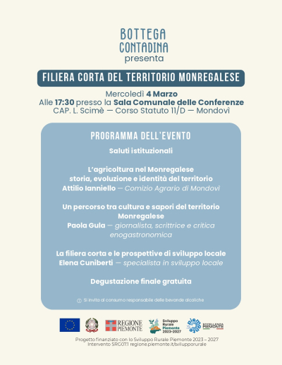 Mercoledì 4 marzo alle ore 17.30 presso la Sala conferenze Scimè la Bottega Contadina propone un incontro sul tema dell'agricoltura monregalese e la filiera corta. Al termine degustazione gratuita.