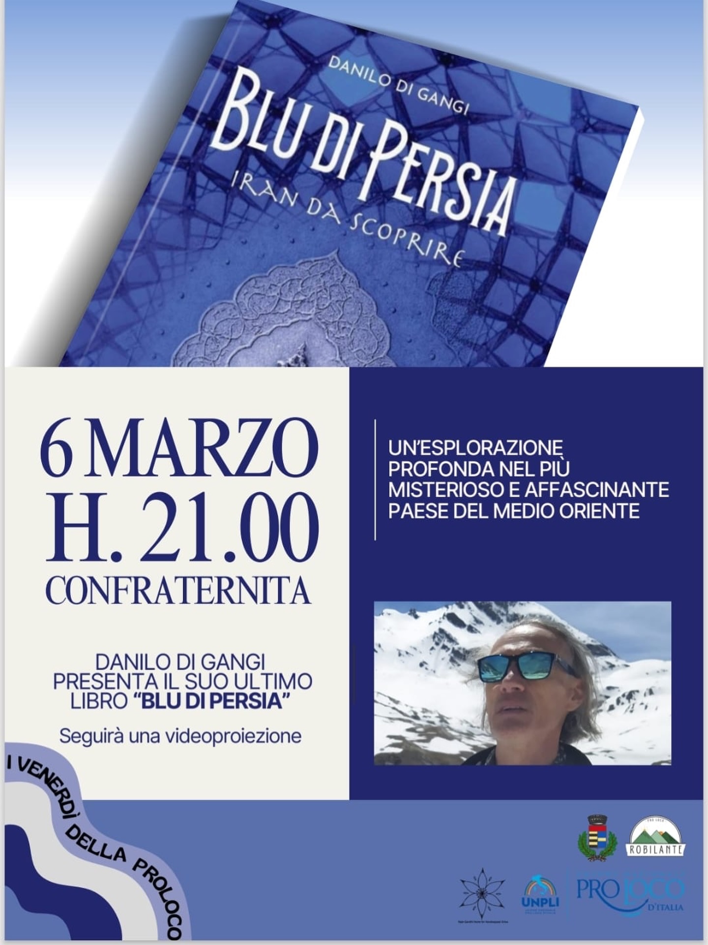 Venerdì 6 marzo, alle 21 presso la Confraternita di Robilante incontro con Danilo di Gangi per la presentazione del suo libro “Blu di Persia. Iran da scoprire”. Ingresso libero.
