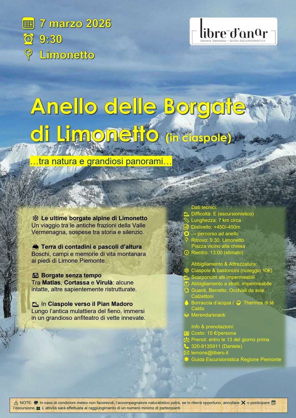 Il 7 marzo a Limonetto (Limone Piemonte) è organizzata un'escursione guidata alla scoperta delle antiche borgate alpine della valle Vermenagna. Un itinerario ad anello da percorrere con le ciaspole, immersi in un paesaggio dove il tempo sembra essersi fermato tra boschi, pascoli d’altura e memorie della vita montanara ai piedi di Limone Piemonte. Prenotazione obbligatoria.
