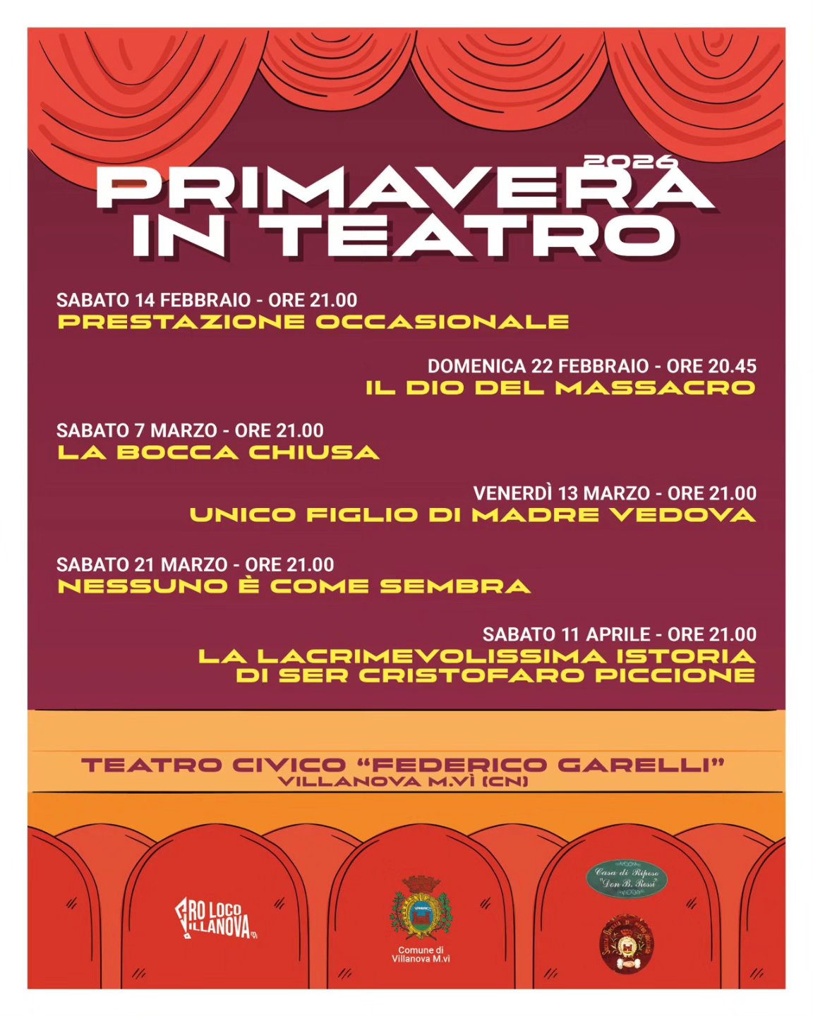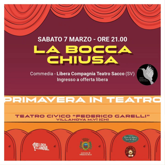 Sabato 7 marzo alle ore 21.00 a Villanova Mondovì vi aspetta lo spettacolo teatrale "La bocca chiusa", una commedia messa in scena dalla Libera Compagnia Teatro Sacco (SV). Ingresso a offerta libera. Appuntamento presso il teatro civico "Federico Garelli". L'evento fa parte della rassegna "Primavera in teatro", nella locandina il programma completo.