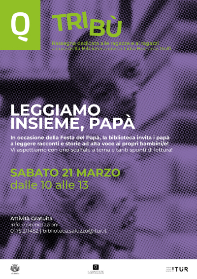 Sabato 21 marzo, alle ore 10.00, presso la Biblioteca Civica di Saluzzo, in occasione della Festa del Papà si terrà "Leggiamo insieme, papà", una mattinata in cui i papà saranno invitati a leggere racconti e storie ad alta voce ai propri bambini. Ingresso gratuito.
