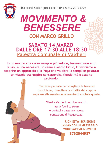 Sabato 14 marzo, dalle ore 17,30 alle ore 18,30 presso la Palestra Comunale di Valdieri, in occasione della rassegna "Marzo in Rosa" vi attende un incontro rigenerante con il maestro yoga Marco Grillo. Evento gratuito, prenotazione necessaria.