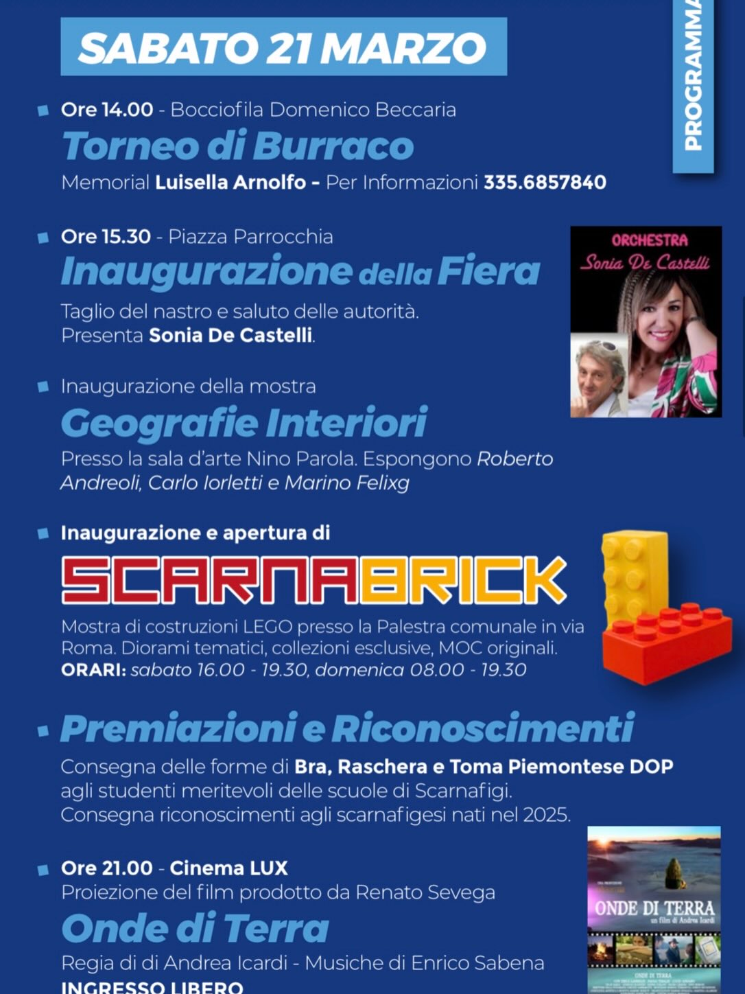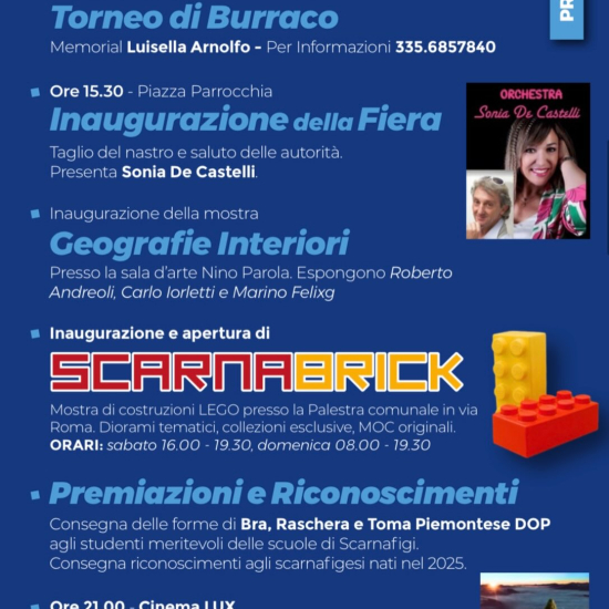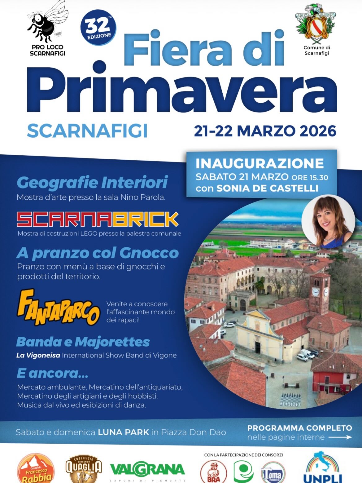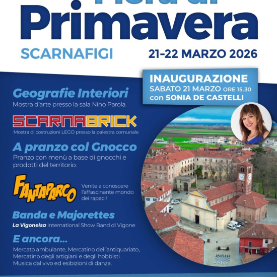 Sabato 21 e domenica 22 marzo 2026 si terrà a Scarnafigi la Fiera di Primavera. Per le vie del paese ci saranno il mercatino dell’antiquariato, bancarelle di artigiani e hobbisti, musica dal vivo ed esibizioni di danza. È previsto anche un raduno di auto d’epoca e tante altre iniziative per tutti. Inaugurazione sabato alle ore 15.30.