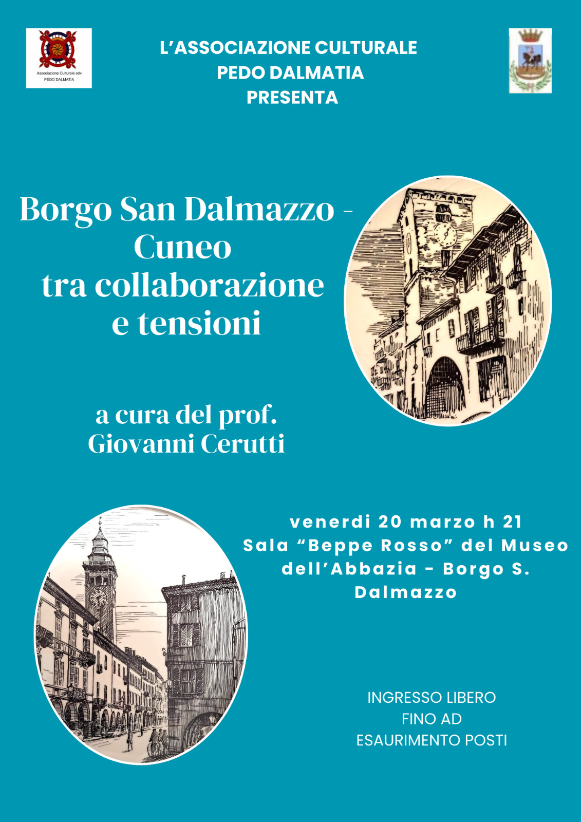 La sera di venerdì 20 marzo alle h 21, nella Sala “Beppe Rosso” del Museo dell’Abbazia di Borgo San Dalmazzo, l'associazione Pedo Dalmatia propone: “Borgo San Dalmazzo-Cuneo, tra collaborazione e tensioni”. Una serata per scoprire ed addentrarci nella storia di due città che derivano una dall’altra.