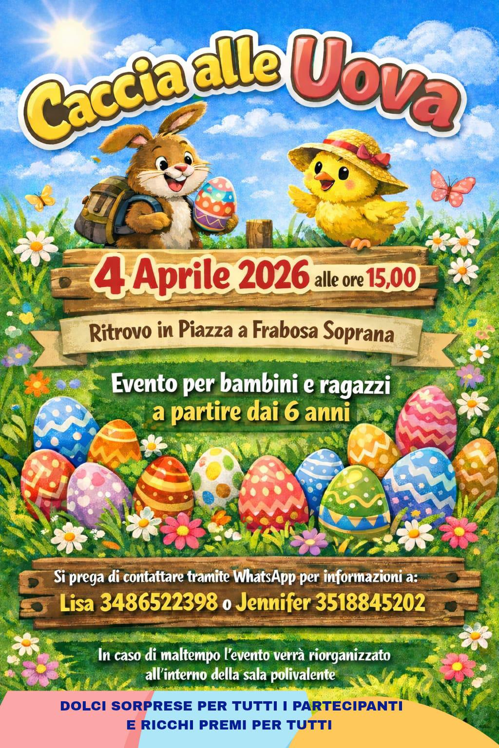 Sabato 4 aprile alle ore 15.00 tutti i bambini e i ragazzi a partire dai 6 anni sono invitati alla caccia alle uova di Frabosa Soprana, con ritrovo in piazza. Maggiori informazioni ai numeri +39 348 652 2398 e +39 351 884 5202. In caso di maltempo l'evento sarà organizzato all'interno della sala polivalente.